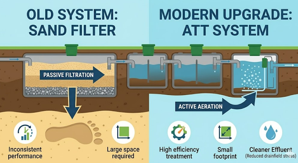 - Upgrading from a sand filter to an ATT system requires a site assessment and professional installation to meet local regulations