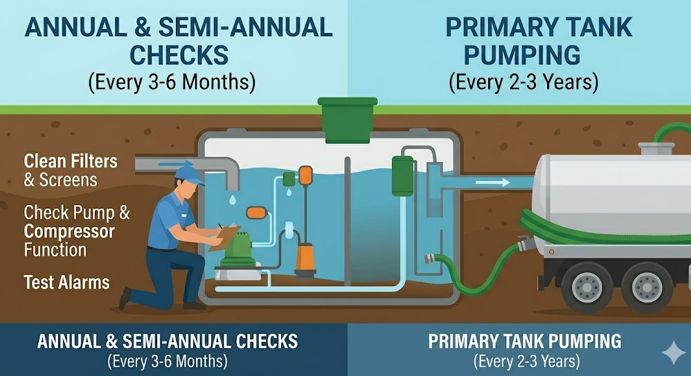 - Pumping the primary septic tank every 2–3 years